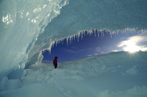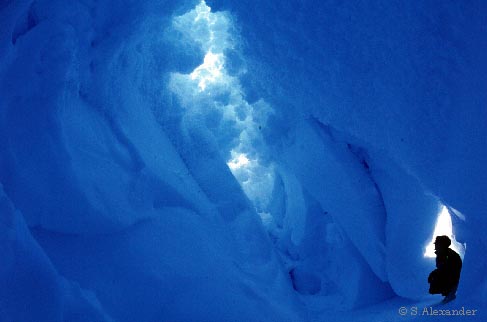 The Erebus Ice Tongue floats out into McMurdo Sound. Here in a cave at the snout, formed by the glacier to the left and sea ice to the right, the Antarctic Sun peeks in at the accumulated snow.