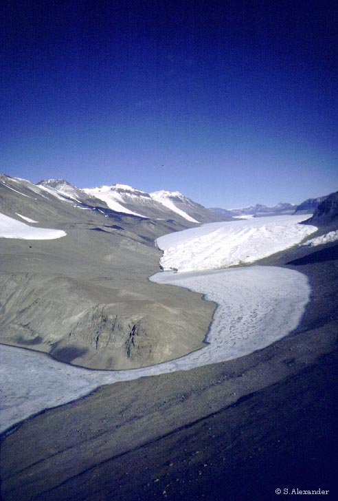 These lakes, along with others in the Dry Valleys are continuously ice covered. Below the ten foot thick ice, is liquid and saline water that remains unfrozen the year round. In the background is the Taylor Glacier and the Trans-Antarctic Mountains.