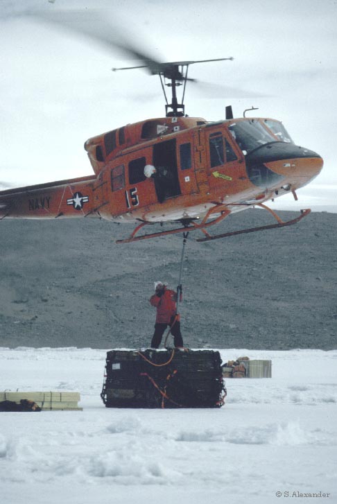 Field camps are often set up only for the summer season. Here, a twin Huey is being hooked up to collapsed sections of a pre-fabricated building to move them to their final location.