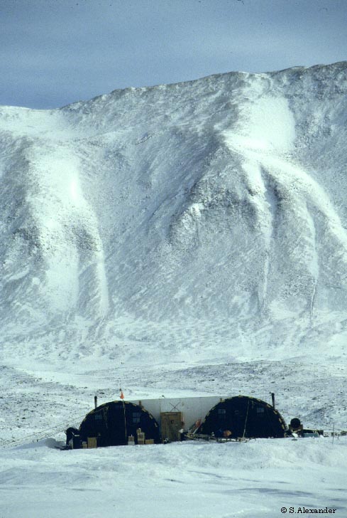 The field camp at Explorers Cove under a light blanket of snow. Located at the edge of the Taylor Dry Valley, this hut was used by science teams studying marine biology.
