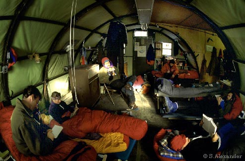 Antarctic diving is strenuous, even with dry suits. A good deal of time is spent resting and recovering from the cold. Here a field party in a warm hut takes time to write in their journals or rest.
