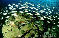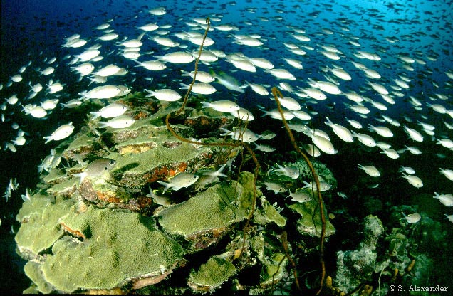 A school of Brown Chromis swarm over a coral head in synchrony.