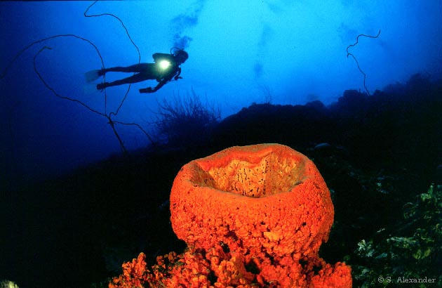 Exploring a deep wall, a diver finds a huge orange vase sponge.