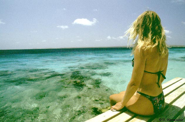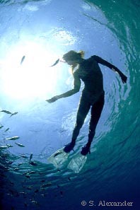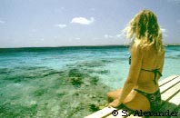 A snorkel diver feeds the fish in the crystal clear Caribbean waters of Bonaire in the Netherlands Antilles.